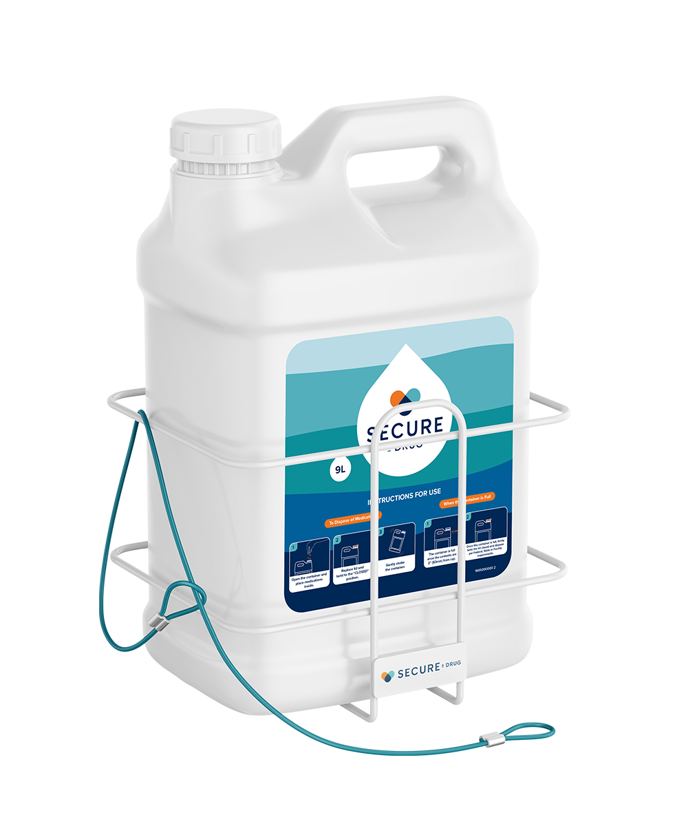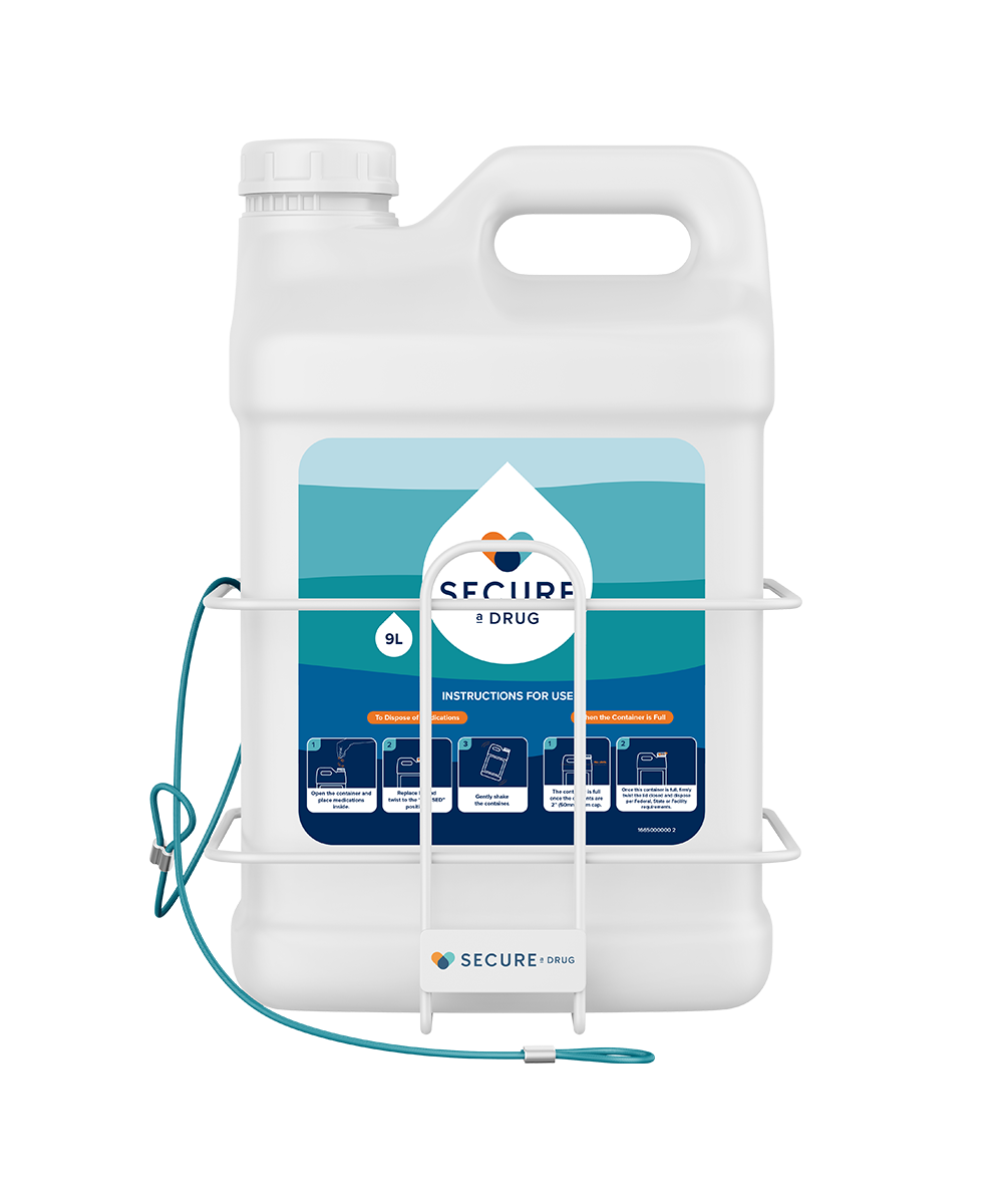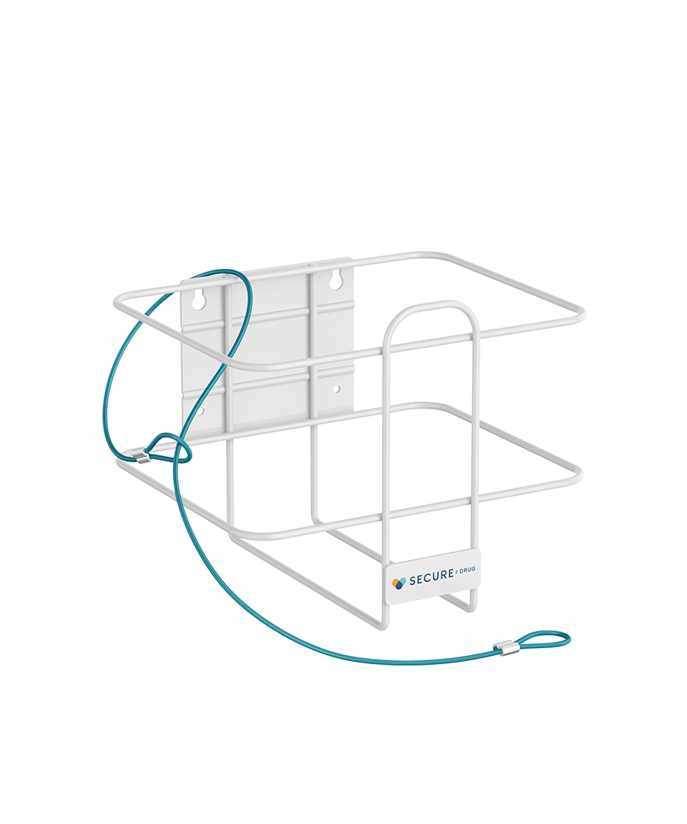 This durable wall bracket keeps Secure a Drug 9L Containers secure, compliant, and accessible. The stainless steel vinyl coated wire threads through the container handle to prevent tampering or removal. Locking mechanism not included.
